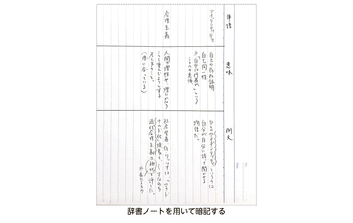 この例のように、理解を深めるべき単語の意味と例文を1冊のノートにまとめます。主体的にまとめることで記憶に定着させやすくなりますし、試験前の復習も効率よくできるようになります。