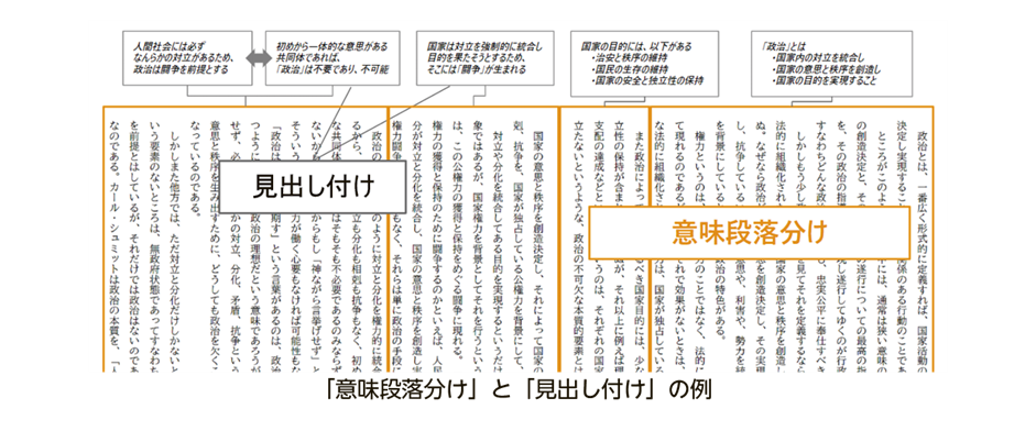 復習では「見出し付け」をするのがおススメです。まず文章全体を意味段落に分け、各段落に簡単に見出しをつけます。そうすることで、文章全体の流れを整理することができます。見出し付けのあとに、文章全体の要約までできると完璧です。