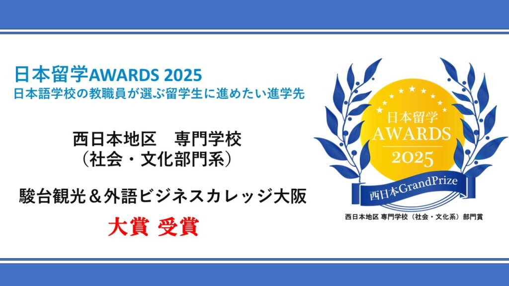 学校法人駿河台学園(本部:東京都千代田区、以下「駿台」)が運営する専門学校グループ駿台観光&外語ビジネスカレッジ大阪が、一般財団法人 日本語教育振興協会にて実施された『日本留学AWARDS2025 日本語学校教職員が選ぶ留学生に勧めたい進学先』にて【専門学校 社会・文化系部門】で初の「大賞」を受賞しました。