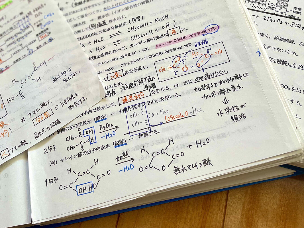 覚えにくい単語や書かないと覚えられないような難しい化学の構造式などは何度も自由帳に書きました。また、体を使うことも大切にして、声に出すことで確実に記憶ができるように工夫していました。このほか、学校の授業や駿台の講座で配布されたプリントはそれぞれをファイルに分けて整理し、必要な時にすぐに見返すことができるようにしました。