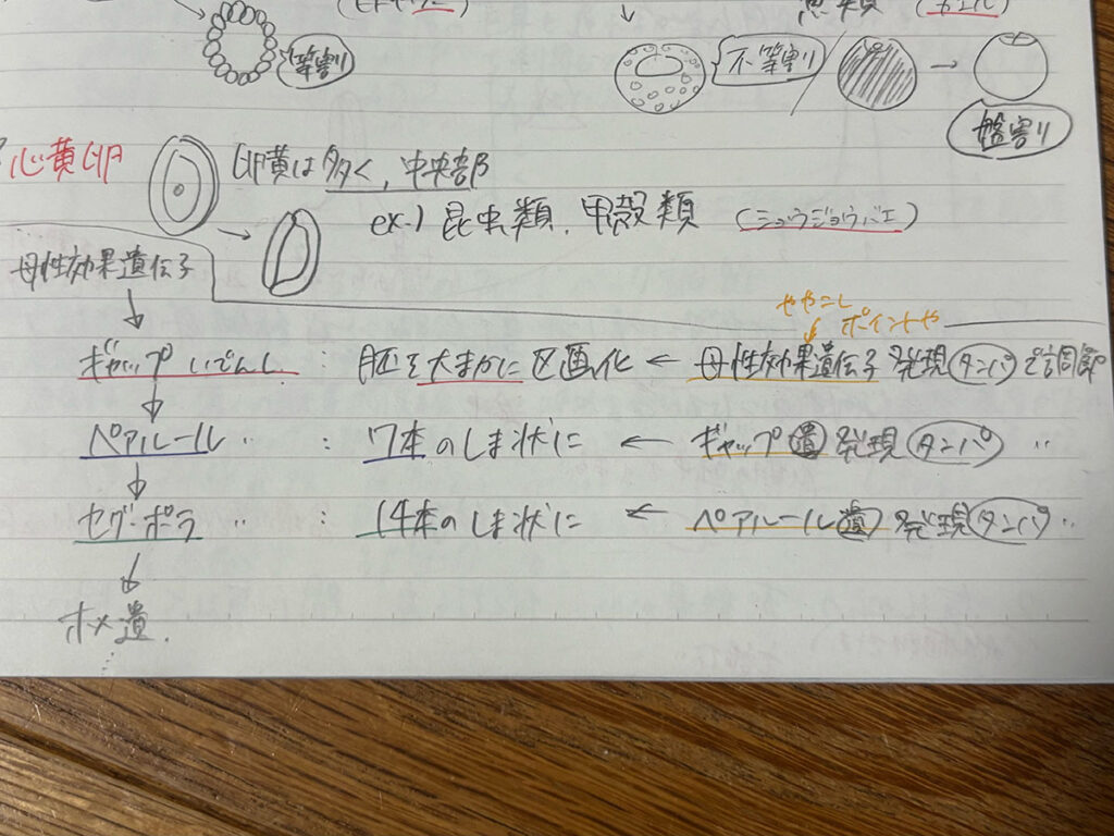 私は、長い単語や画数が多い単語は略語(キサントプロテイン反応=キサプロ、濃硫酸=conc.H2SO4)にして、書く時間を短縮していました。また、ノートを取る時の工夫として→:普通の矢印、-▹(白矢印):時間の経過(○の後に△)、=>:因果関係(○だから△)のように、矢印を使い分けていました。他にも、ペンの色と役割も固定しており、反省点や注意点、ポイントは橙色のペンで書いていました。
