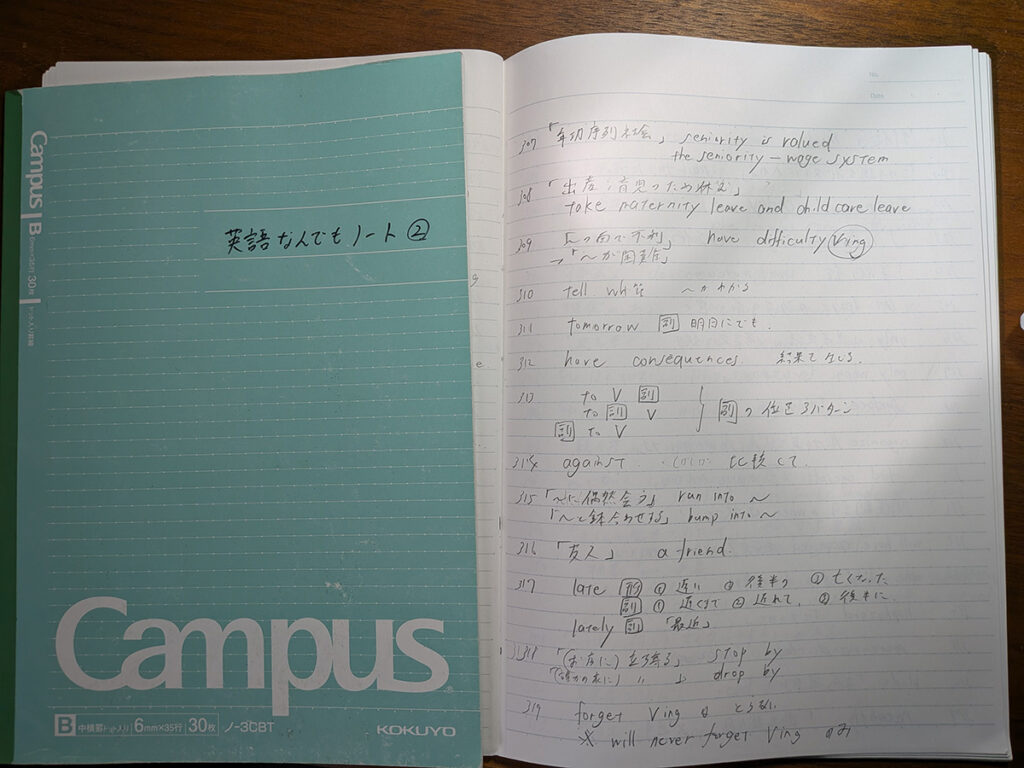 僕は英語の勉強のために「何でもノート」を作り、長文を解いてわからない単語や表現が出てきた時、必ずメモをするようにしていました。一つ一つ番号を振っていたら最後には1200以上になりました。これによって模試の前に自分がどこを間違えたのか復習することができ、自分はこれだけ頑張ったんだという自信にもなりました。