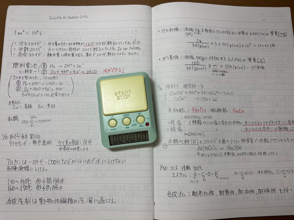 一人で勉強するとだらけてしまったり、わからない問題に時間を使いすぎたりすることが多々ありました。自分が問題を解くのににどれだけ時間を要しているかが把握できるよう、タイマーで時間を計りながら勉強していました。これは過去問演習で時間配分を考える時にも役に立ちました。また、過去問を解く時は何の知識が不足していて解けなかったのか考え、それをノートにまとめて受験本番に見返せるようにしていました。