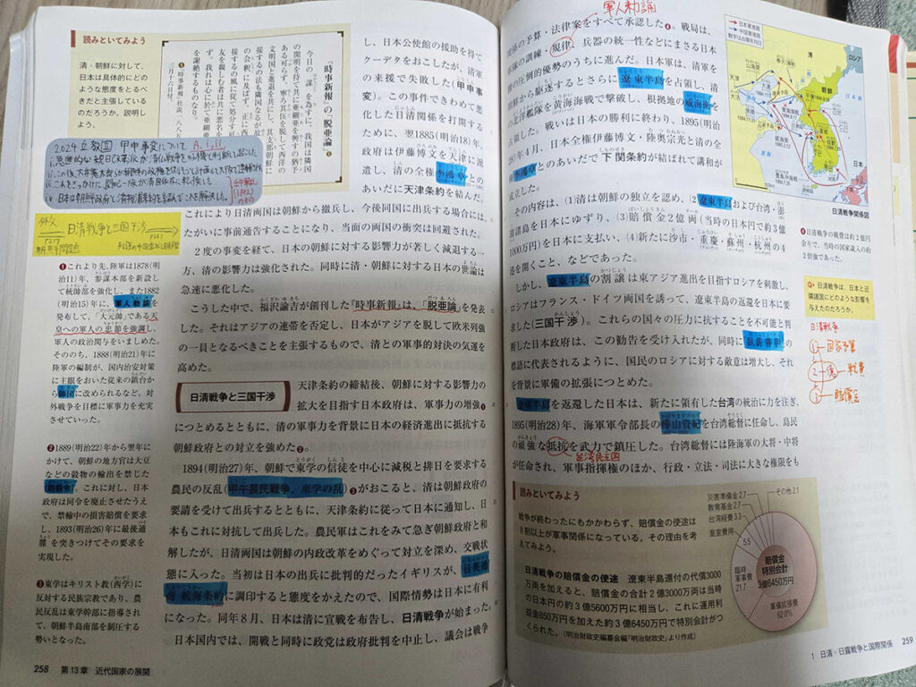 古文・英語・日本史の単語帳は、多くの人が間違えたり苦手意識がある単語に付箋を貼って、付箋のところのみ復習するという学習をしているように感じるのですが、個人的には間違えたものや定着しているものも含めて、何度も復習するべきだと思います。本当の定着に繋がりますし、日本史のような歴史系の科目であれば、時代の流れも身に入ると感じました。